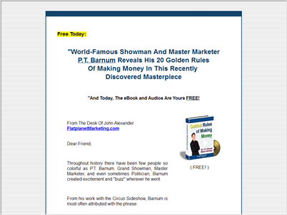 Website offering the classic motivational book "Golden Rules For Making Money" by P.T. Barnum. -