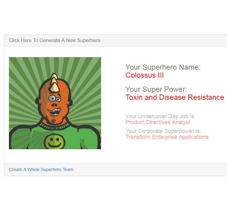 Fun Ruby on Rails app that generates your own super hero name and super power. Create one superhero or a whole team of them! This was a fun little weekend project... -