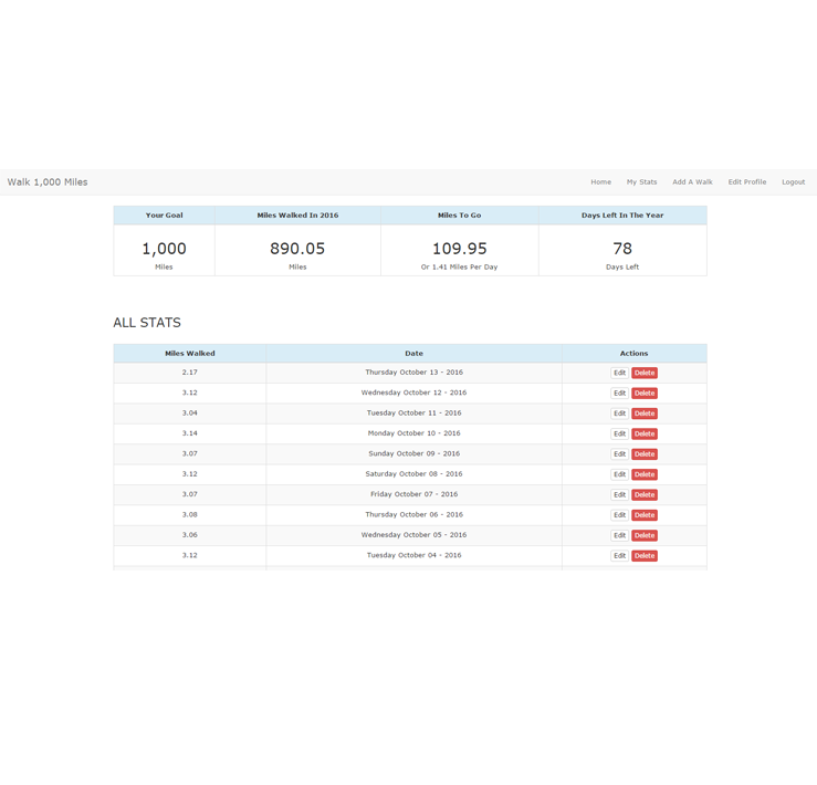 Quick Ruby on Rails app that dynamically tracks and displays how many miles I walk per year, counting down to my goal of 1,000 miles per year. Does simple calculations, user login/out authentication, database to hold data, etc... -