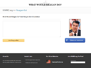 Spoof website asking "What Would Reagan Do?" Created a Ronald "Reagan-bot" that allows visitors to ask questions and get automated bot answers. -
